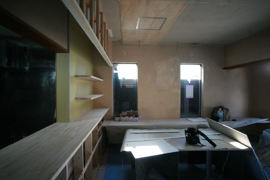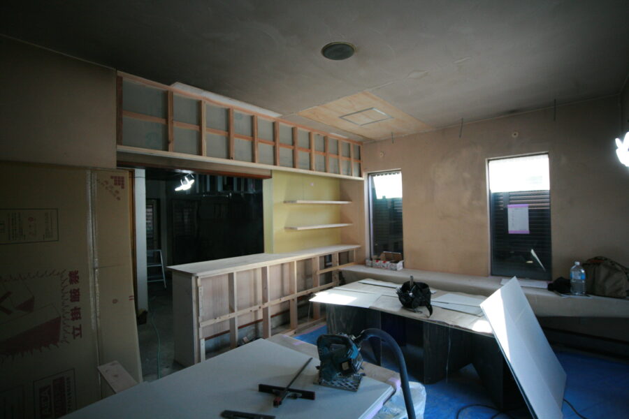 飲食店の店舗内装リノベーションにてカウンター造作~塗装下地プラスターボード貼り施工状況