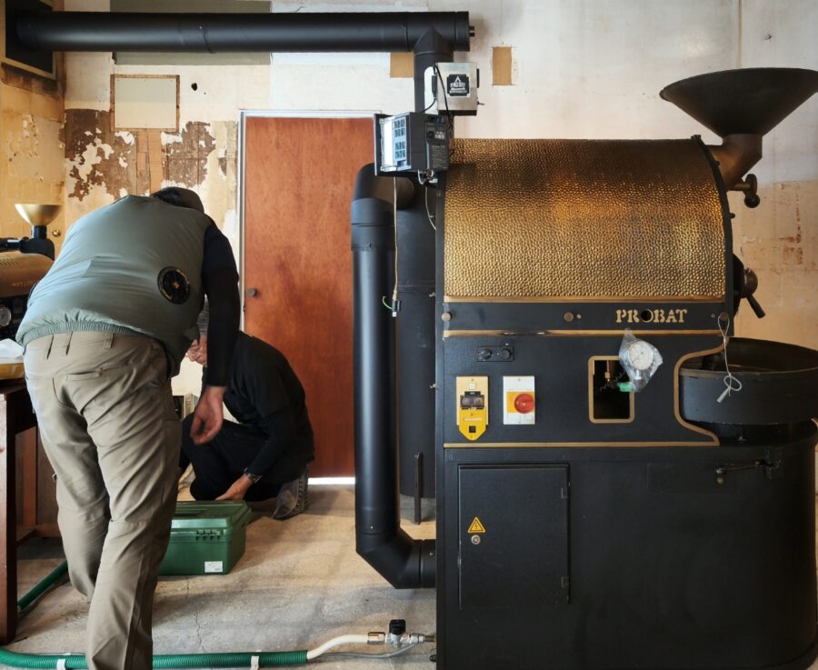 PROBAT珈琲焙煎機設置するために煙突開口~電源工事~本体設置状況