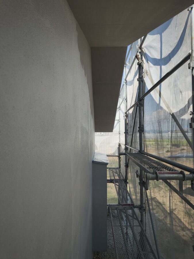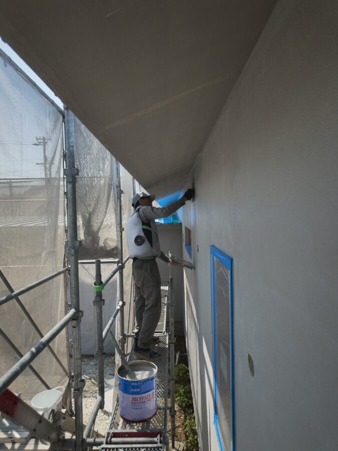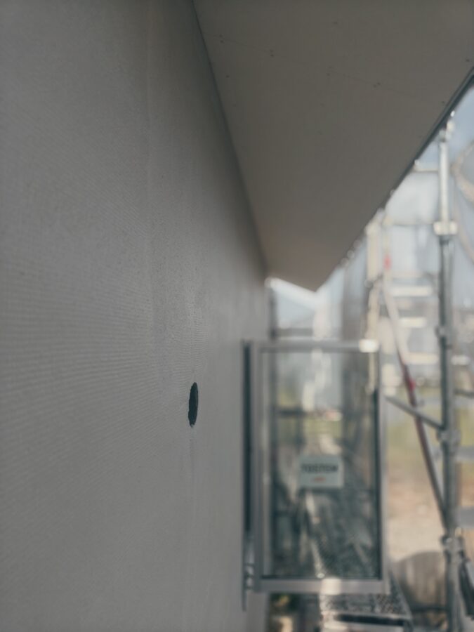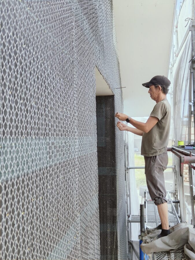 住宅新築工事にて外壁のラスモルタル工事状況