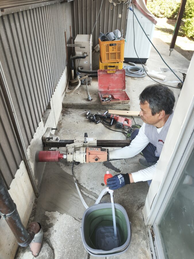 住宅リノベーションにて給排水配管工事のためコンクリート基礎にコア抜き工事状況