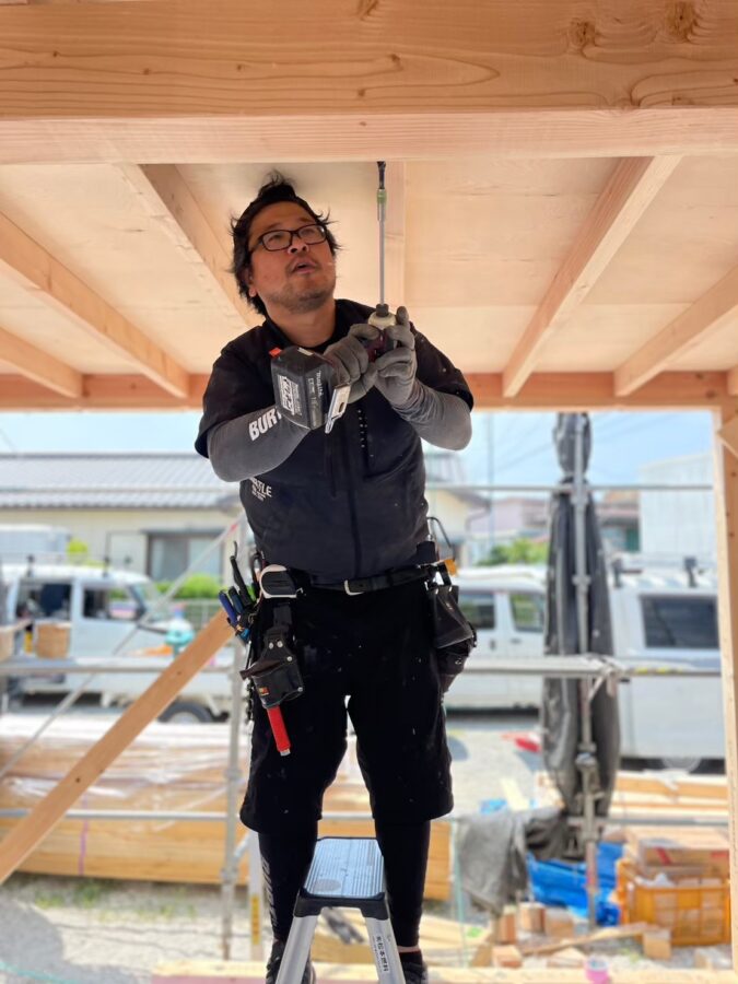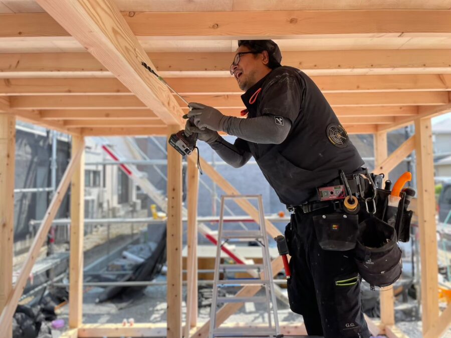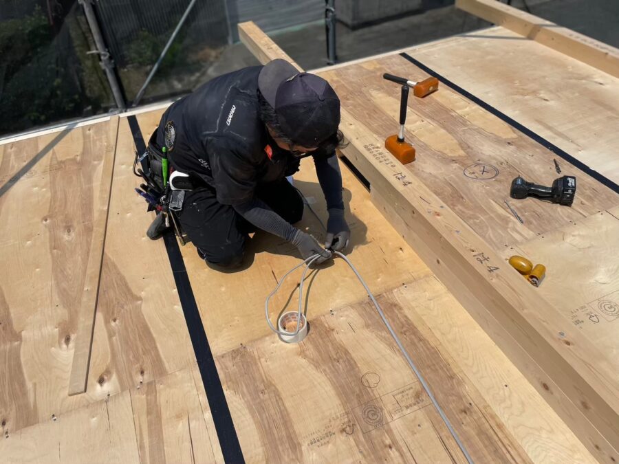 木造店舗新築工事にて電気配線工事状況